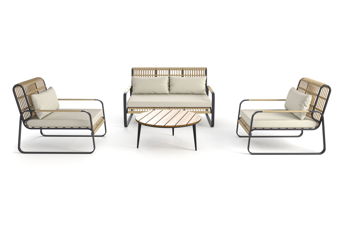 Im Lieferumfang sind ein großzügiges Sofa, zwei bequeme Sessel und der runde Loungetisch enthalten. Die innovative Stauraumfunktion in der Rückenlehne und die praktischen Kunststoff-Füße tragen zur Funktionalität und Langlebigkeit der Lounge bei und ermöglichen eine einfache Handhabung.