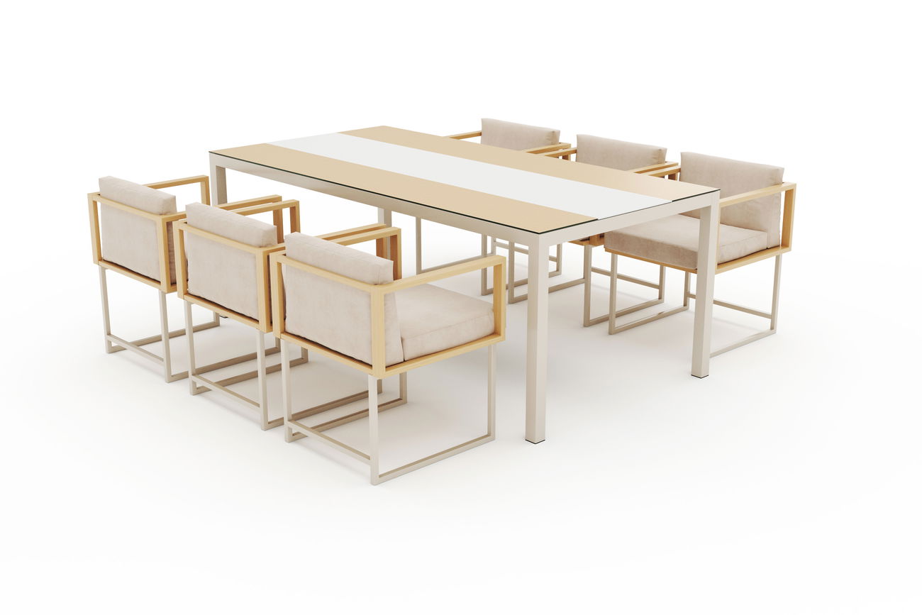 Die Kombination aus robustem Aluminiumrahmen mit edler Holzoptik-Beschichtung verleiht dem Set eine natürliche und gleichzeitig moderne Ausstrahlung. Die sorgfältig verarbeitete Tischplatte aus hochwertigem Material besticht durch ihre Langlebigkeit und pflegeleichte Oberfläche. Die eleganten champagnerfarbenen Tischbeine sorgen für einen harmonischen Kontrast und runden das Design stilvoll ab.