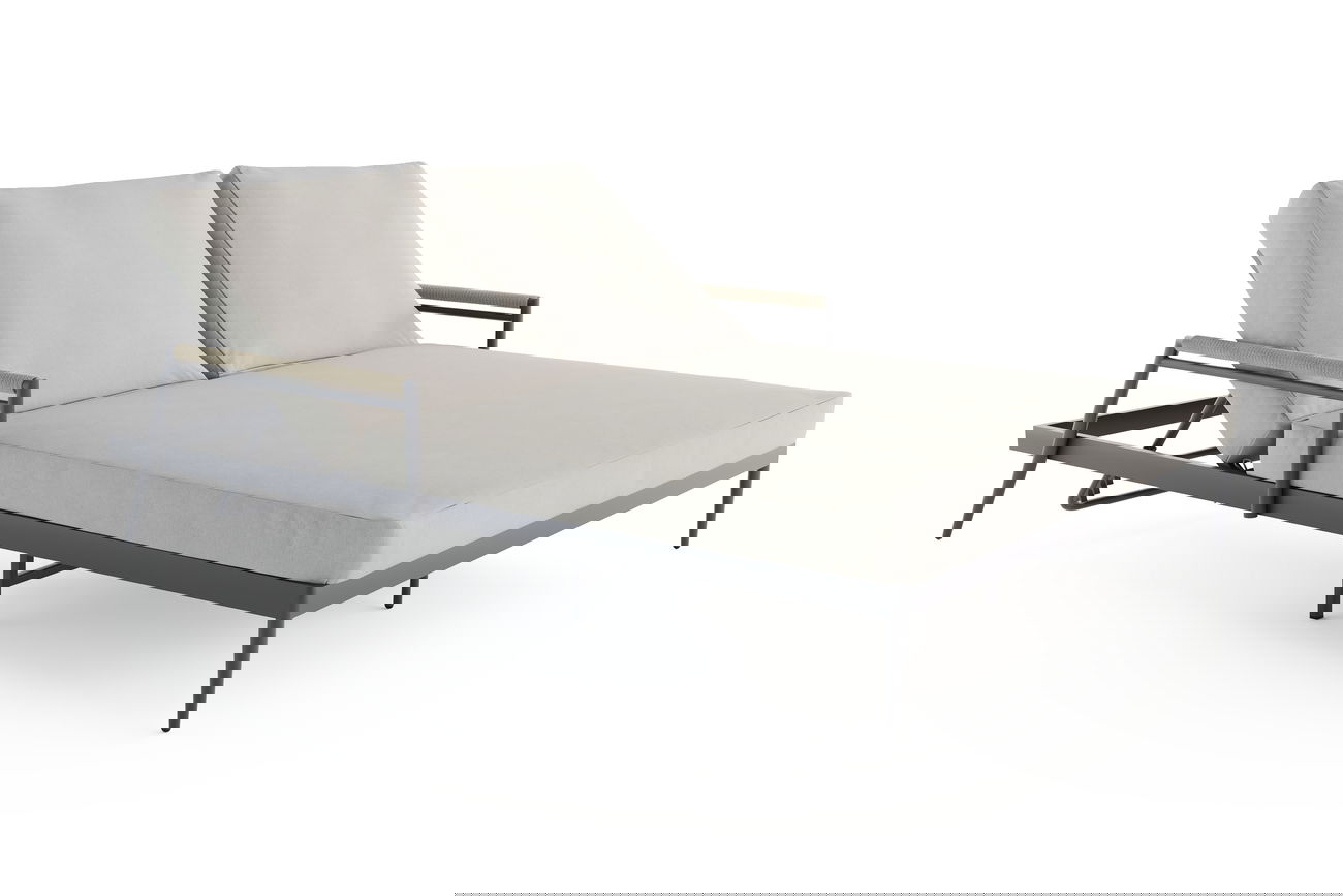 Tauchen Sie ein in ein Meer der Ruhe und lassen Sie den Alltagsstress hinter sich, während Sie sich gemeinsam auf dieser eleganten Doppelliege mit Armlehnen niederlassen. Das herausragende Design, geschaffen aus einem robusten Aluminiumgestell in verführerischem Anthrazit, verkörpert zeitlose Eleganz und modernen Stil.