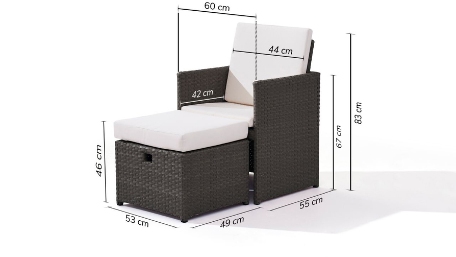 Kissen & Auflagen hoher Sitzkomfort, 5 cm dicke Sitzauflage, Schaumstoff, 5 cm dicke Rückenpolster, Schaumstoff Gewicht Stuhl & Hocker, je 2 St. ca. 25 kg Material Polyrattan Montage Montage nicht erforderlich Sitzplätze bis zu 2 Obermaterial Hochwertiges Polyrattan, 12 mm breit, angeraut, wasserfest, 100% handgeflochten, Farbe: anthrazit, einfarbig, durchgefärbt Gestell Aluminium, pulverbeschichtet, Stärke bis zu 1,2 mm, robust, rostfrei, wetterbeständig Bezug crema, 100% Polyester, abnehmbar, waschbar bei 30°C, robuste Verarbeitung, hohe Festigkeit, verdeckte Reißverschlüsse, einfarbig, durchgefärbt, vorimprägniert Eigenschaften Traglast bis zu 120 kg pro Sitzplatz, wetterbeständig, pflegeleicht, Hocker als Tisch nutzbar, Rückenlehne ergon. geformt, 3 cm breite Armlehnen, Rückenlehne klappbar, Stühle und Hocker kompakt verstaubar Artikelnummer 900221213 Sicherheitshinweise