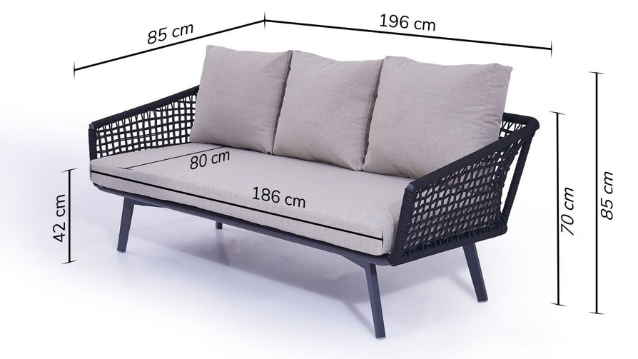 Kissen & Auflagen hoher Sitzkomfort, dicke Rückenpolster, Kunstfaser, 11 cm dicke Sitzauflagen, Schaumstoff Gewicht Sofa ca. 15 kg Material Aluminium, Rope Montage Montage des Untergestells erforderlich Sitzplätze bis zu 3 Obermaterial 100% handgeflochten, einfarbig, Farbe: schwarz, schnell trocknend, 100% Olefin Seil, Ø 6 mm rund Gestell Aluminium, pulverbeschichtet, robust, rostfrei, wetterbeständig, Stärke bis zu 1,5 mm Bezug steingrau, 100% Olefin, abnehmbar, waschbar bei 30°C, robuste Verarbeitung, hohe Festigkeit, verdeckte Reißverschlüsse, mehrfarbig, vorimprägniert, durchgefärbt Eigenschaften Traglast bis zu 120 kg pro Sitzplatz, wetterbeständig, pflegeleicht Artikelnummer V946219926 Sicherheitshinweise