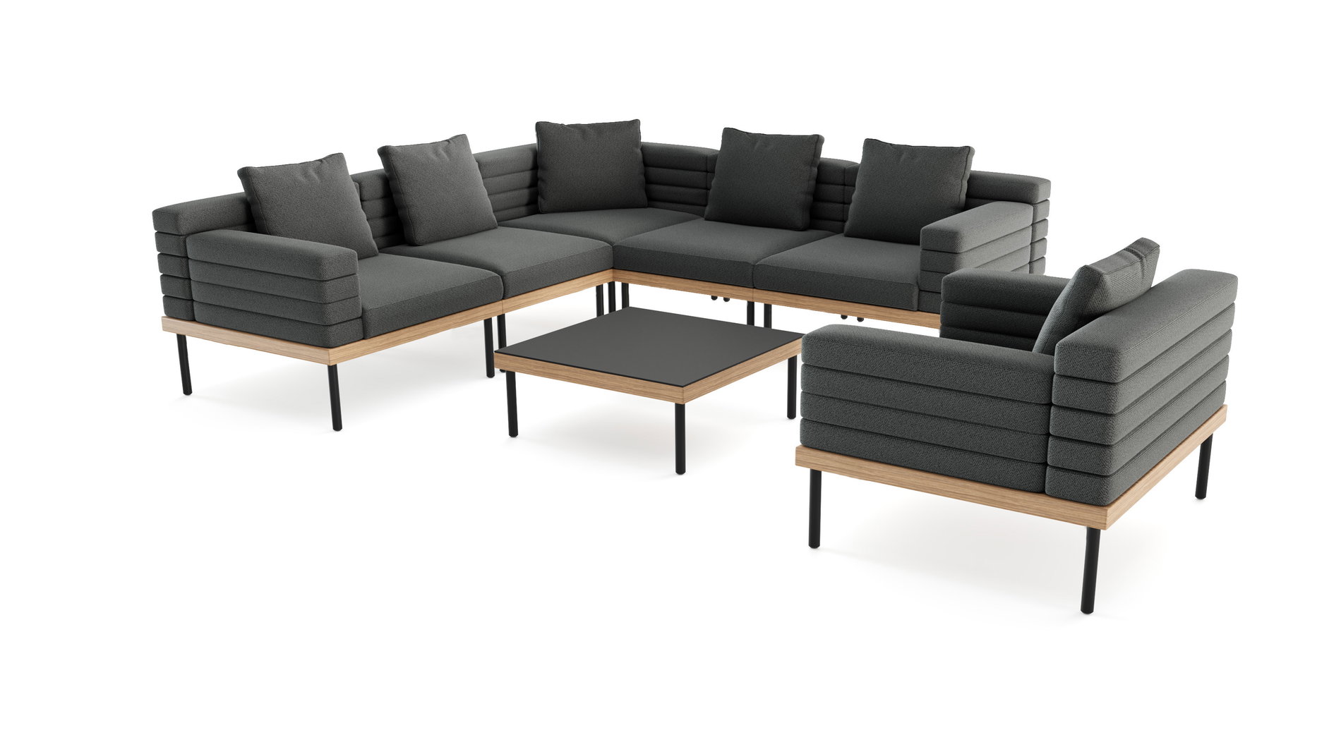 Bezogen mit dem tiefdunklem Obsidian-Stoff, bringt die Luma Lounge Light Plus eine moderne, edle Note in jede Outdoor-Umgebung. Die samtmatte Oberfläche trifft auf eine klare Linienführung – reduziert, aber niemals kühl. Frei kombinierbare Module erlauben Ihnen Freiheit in der Gestaltung: von der luftigen Relax-Insel bis zur kommunikativen Lounge für lange Sommernächte.