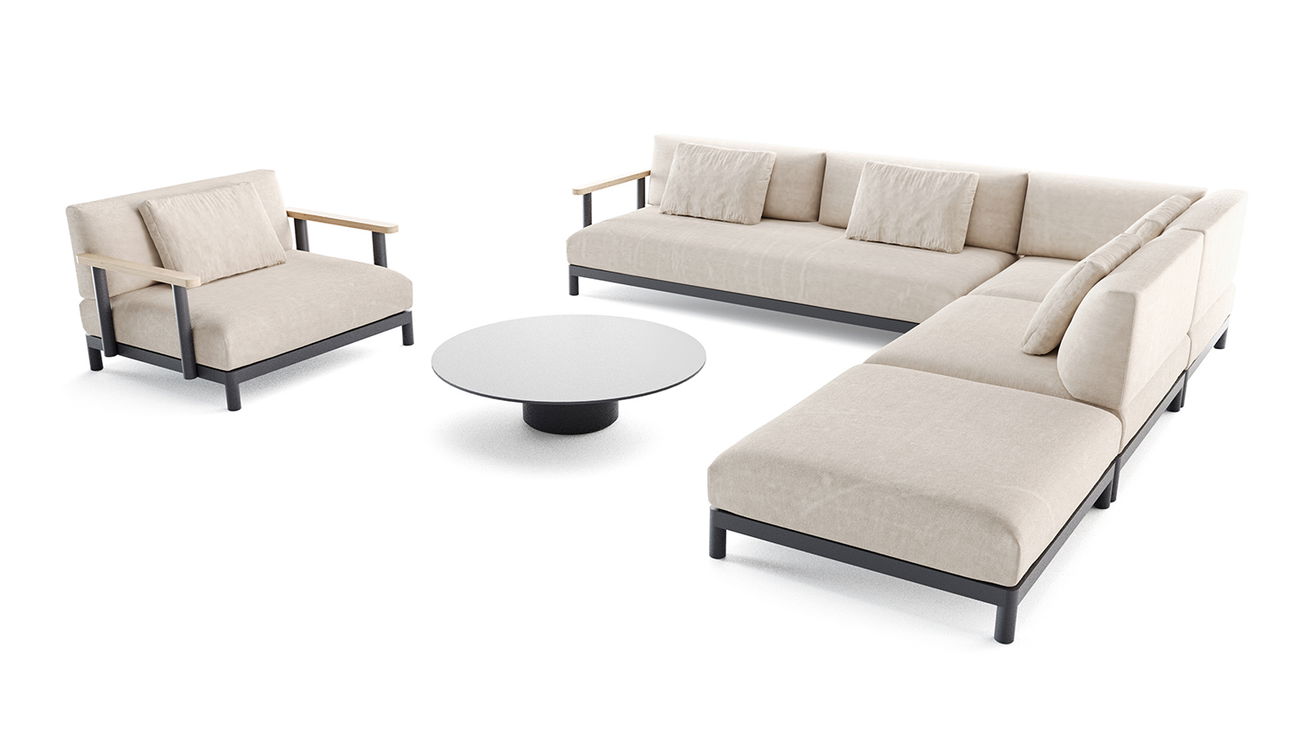 Designer Aluminium Sitzgruppe Alima mit Teakholz Armlehnen erhältlich nur bei Living Zone. Gratis Versand.