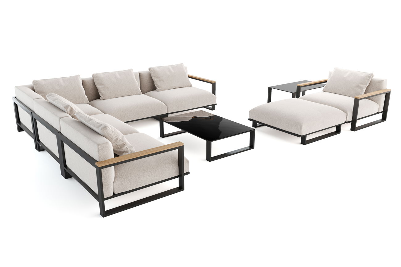 Das Set umfasst ein großzügiges Ecksofa, einen bequemen Sessel sowie einen Loungetisch mit eleganter schwarzer Tischplatte. Ein zusätzlicher Beistelltisch, der über dem Loungetisch platziert werden kann, erweitert die praktischen Möglichkeiten dieses Ensembles. Zwei Mittelsofas und zwei Abschlusselemente ermöglichen Ihnen maximale Flexibilität bei der individuellen Gestaltung Ihrer Lounge.