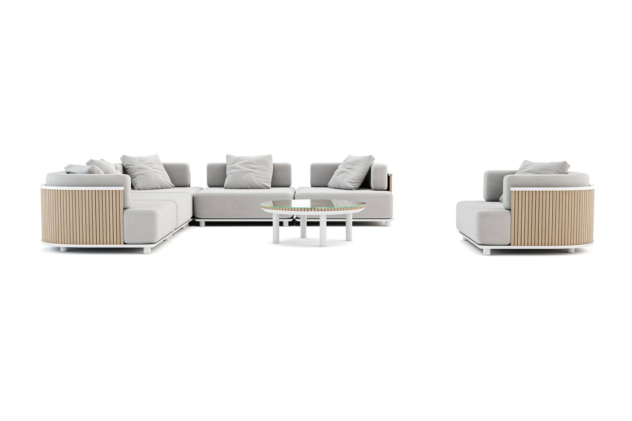 Der Lounge Tisch, ebenfalls aus weißem pulverbeschichtetem Aluminium gefertigt, setzt ein weiteres Statement in Sachen Raffinesse. Die Tischplatte präsentiert sich als Meisterstück modernen Designs und besteht aus einzelnen Teakholz-Latten, die einen harmonischen Kreis formen. Ein abschließendes Highlight bildet die transparente Glasplatte, die nicht nur für einen eleganten Abschluss sorgt, sondern auch das luxuriöse Gesamtbild unterstreicht.