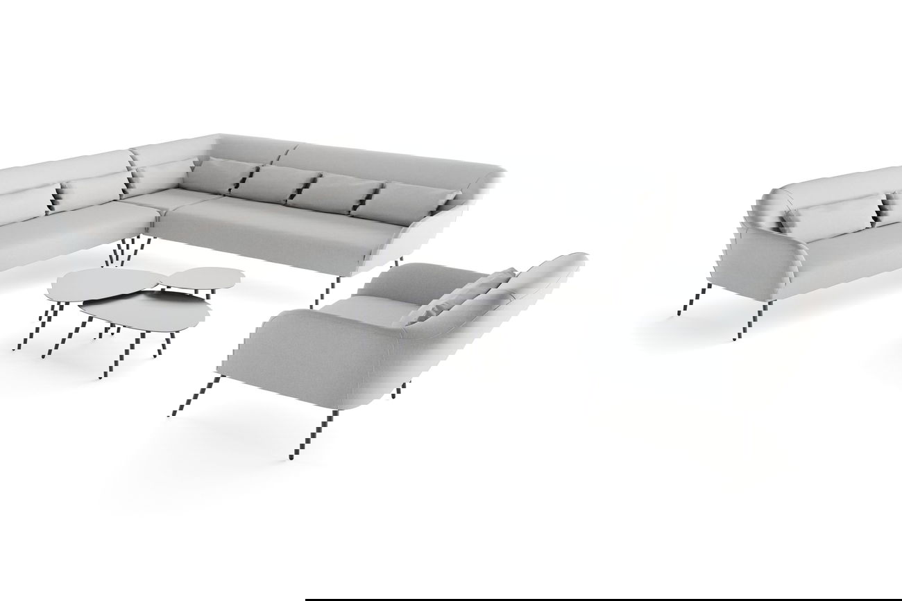 Jedes Element dieser Lounge ist meisterhaft gefertigt, von den dick gepolsterten Sitzen bis hin zu den eleganten Aluminiumbeinen in Anthrazit, die nicht nur für Stabilität, sondern auch für modernes Flair sorgen. Das graue Polster strahlt Eleganz aus und lädt zum Verweilen ein.
