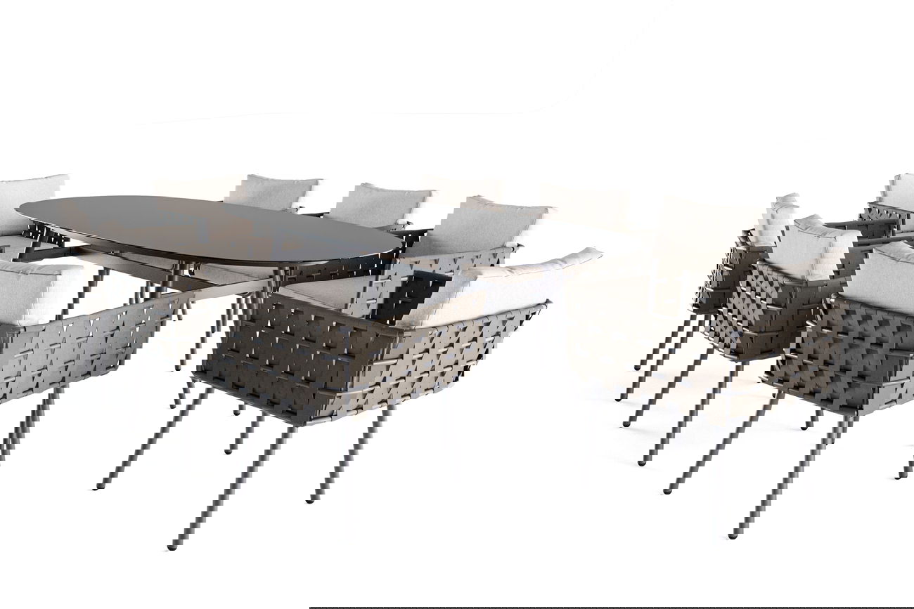 Die Arm- und Rückenlehnen der Stühle bestehen aus robustem Aluminium und sind mit einem edlen Ropegeflecht in graubrauner Farbe versehen, das ein Gefühl von Exklusivität vermittelt. Die großzügig gepolsterten Sitze in einem warmen Beige bieten höchsten Komfort und laden zu entspannten Dining-Erlebnissen ein.