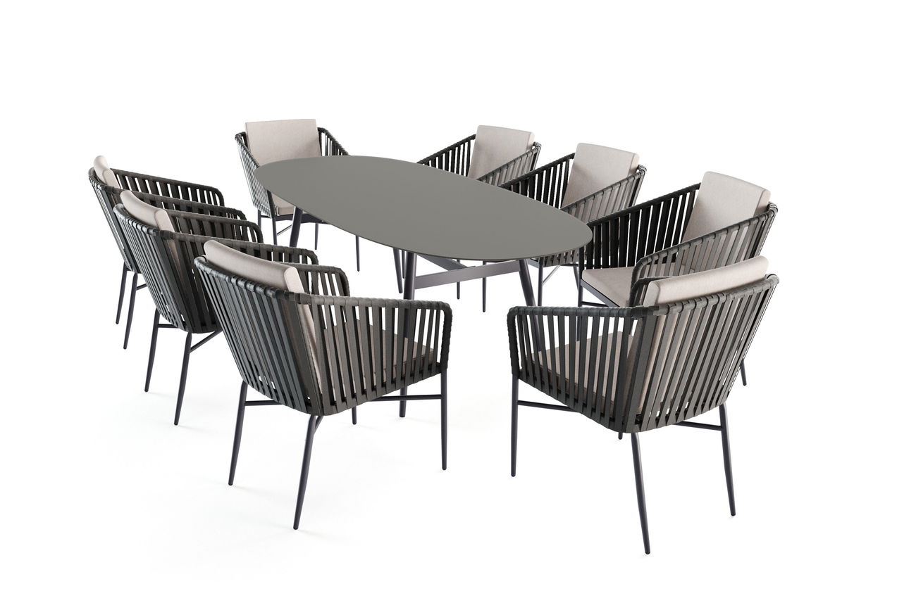 Der Esstisch, ausgestattet mit einer 5 mm starken Tischplatte aus ESG-Sicherheitsglas in stilvollem Milchglas-Design, verleiht Ihrem Außenbereich eine elegante Note. Die matte, anthrazitfarbene Oberfläche harmoniert ideal mit dem handgeflochtenen Obermaterial aus 20 mm breitem Olefin-Seil. Dieses Material ist nicht nur optisch ansprechend, sondern auch langlebig und wetterfest.
