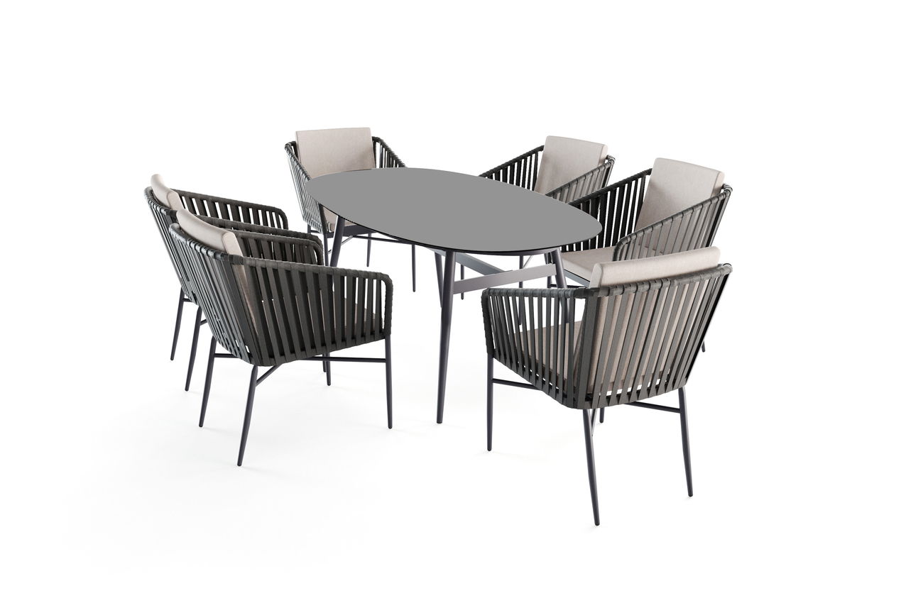 - Erweiterte Produktbeschreibung- Eigenschaften - wetterbeständig, pflegeleicht, Traglast bis zu 110 kg pro Sitzplatz - Kissen & Auflagen - 5 cm dicke Sitzauflage, Schaumstoff, 5 cm dicke Rückenpolster, Schaumstoff - Gewicht - Esstisch ca. 35 kg, Stuhl ca. 5 kg - Material - Aluminium, Rope - Montage - Montage nur beim Tisch erforderlich - Tischplatte - Milchglas, ESG-Sicherheitsglas, glatt, anthrazit, matt, Stärke 5 mm - Lieferumfang - 1x Esstisch, 6x Stuhl, Sitzauflagen inklusive - Sitzplätze - bis zu 6 - Obermaterial - 100% handgeflochten, Farbe: anthrazit, einfarbig, durchgefärbt, schnell trocknend, 100% Olefin Seil, 20 mm breit - Gestell - Aluminium, pulverbeschichtet, robust, rostfrei, wetterbeständig, Stärke bis zu 1,2 mm, Tischbeine Ø 6 cm - Produktart - Essgruppen - Bezug - Quartzbeige (meliert), 100% Polyester, 210 gr./m², 100% Olefin, einfarbig, durchgefärbt - Farbe - anthrazit - Artikelnummer - 23417