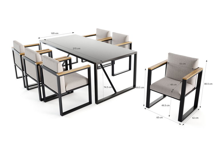 Artikelnummer 36131 Kissen & Auflagen hoher Sitzkomfort, 13 cm dicke Sitzauflagen, Schaumstoff, Quick Dry Foam Eigenschaften Traglast bis zu 150 kg pro Sitzplatz, Teakholz Armlehnen Material Aluminium, Teakholz Montage Montage nicht erforderlich Tischplatte Milchglas, Anthrazit, Stärke 5 mm Lieferumfang 1x Esstisch, 6x Stuhl, Sitzauflagen inklusive Sitzplätze bis zu 6 Obermaterial Farbe: anthrazit, einfarbig, durchgefärbt Gestell Aluminium, pulverbeschichtet, robust, rostfrei, wetterbeständig, Stärke bis zu 1,5 mm Produktart Essgruppen Bezug 100% Polyester, Beige, abnehmbar, waschbar bei 30°C, robuste Verarbeitung, edle Kedernaht, hohe Festigkeit, verdeckte Reißverschlüsse, einfarbig Farbe anthrazit Sicherheitshinweise