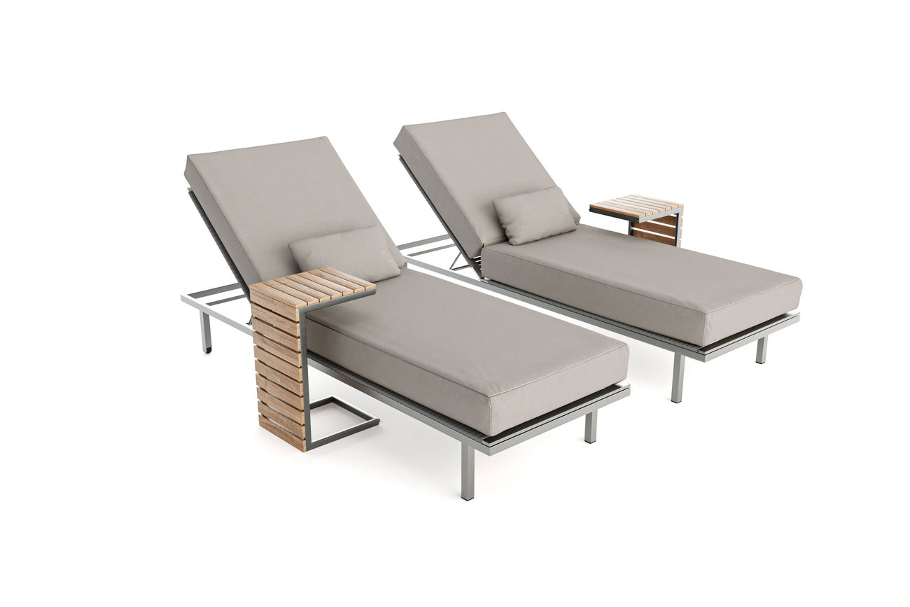 Das Baki Sun Lounger Set wird komplett mit zwei Beistelltischen geliefert, die aus einer harmonischen Kombination von Edelstahl und Teakholzlatten gefertigt sind. Diese eleganten Tische bieten Platz für Ihre Getränke, Snacks oder Bücher und ergänzen das Gesamtbild des Sets perfekt.