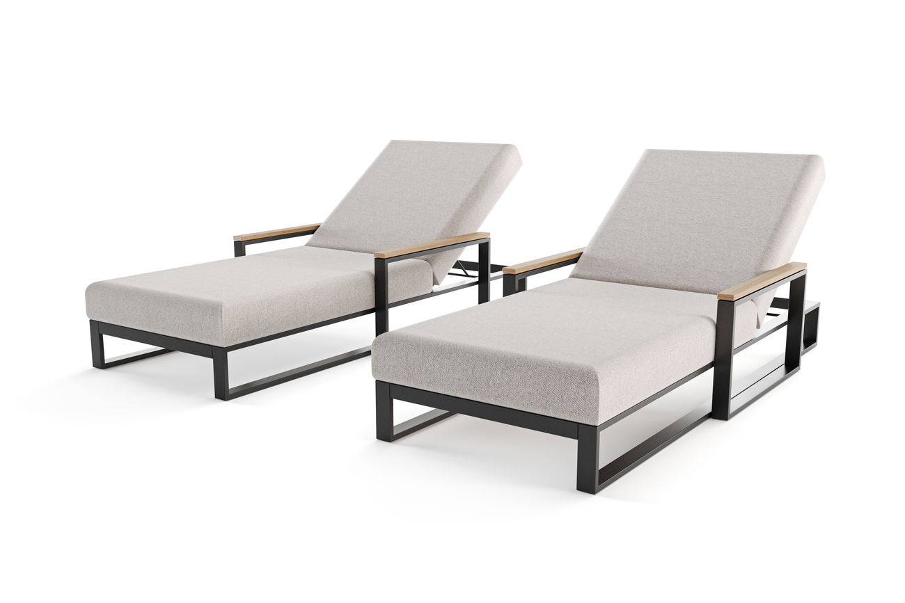 Zwei elegante Sonnenliegen mit Teakholz-Details und komfortabler Quick Dry Polsterung – stilvoll entspannen wie im Luxusresort.