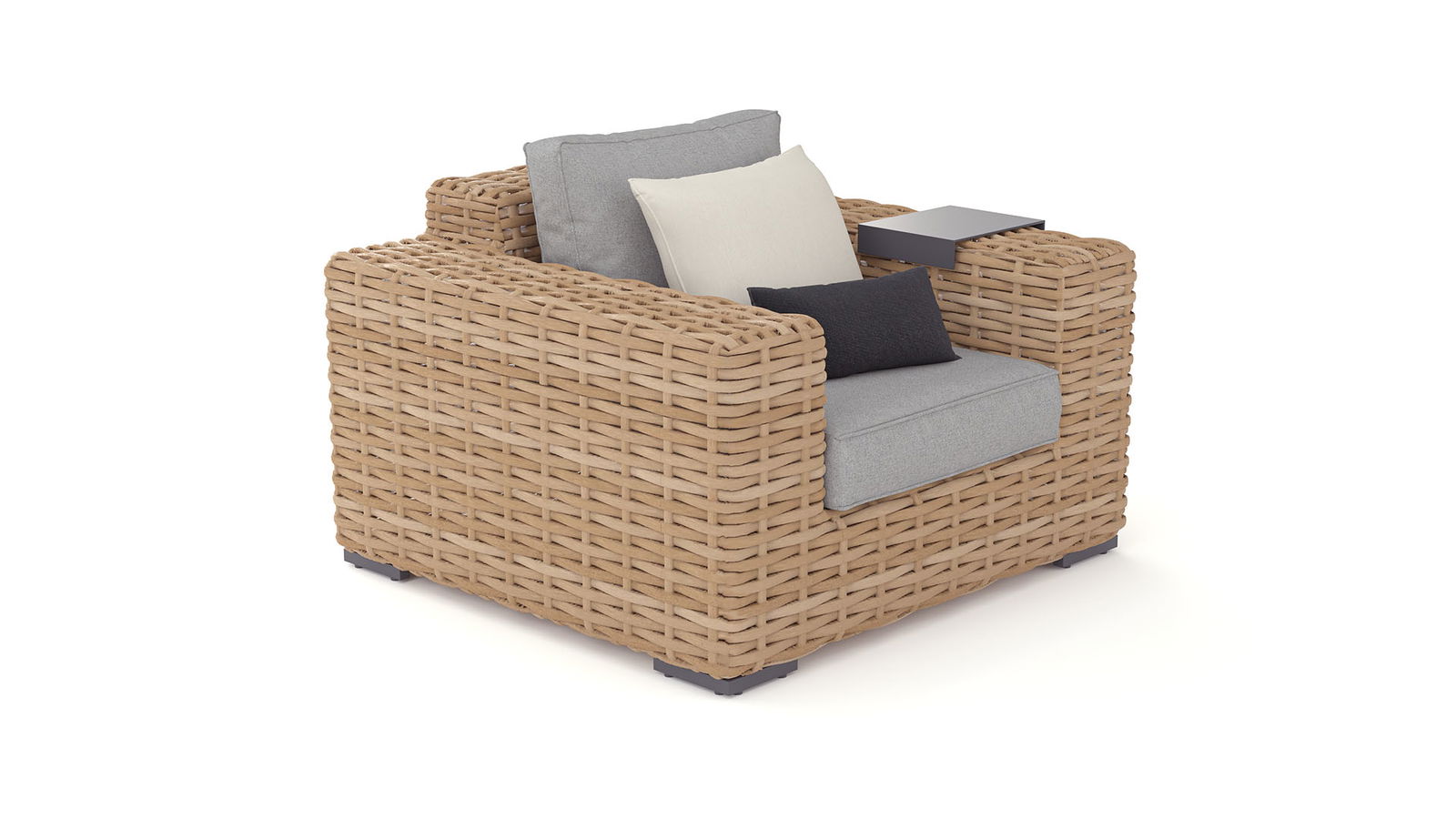Der Sessel aus unserer neuen Kollektion ist perfekt für Gartenfreunde, die ganz grossen Wert auf Gemütlichkeit legen. Der einzigartige Look dieses Sessels entsteht durch die grosse, runde Polyrattanfaser die auf einem Aluminium Rahmen geflochten wird. 15 cm pralle Polster mit edler Kedernnaht sind mit hochwertigen Olefin Bezügen ausgestattet, die Outdoor Eigenschaften aller Materialien sind für Gartenmöbel optimal. Die wunderschöne Kombination aus naturfarbenen runden Rattanfasern und den prallen Polstern in steingrau lassen den Sessel modern und edel aussehen. Verschiedene Sets mit Doppelsofa, Hocker und Couchtisch sind Miramar oder Orlando. So gemütlich kann der Sommer nur schön werden!